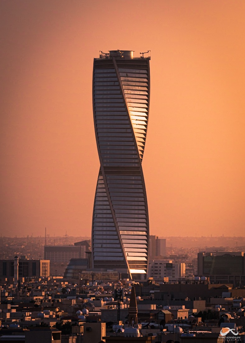 هذه اللوحة بعدسة المصوّر تركي الودعاني، توثق لحظة ذهبية من ساعات الصباح الأولى في قلب العاصمة السعودية. يظهر برج مجدول ملتفًا حول نفسه كتحفة معمارية فريدة، بينما يلامس الضوء الشمسي واجهته الزجاجية فيكشف عن تفاصيله الدقيقة، وكأنه يتنفس الحياة مع بداية يوم جديد.