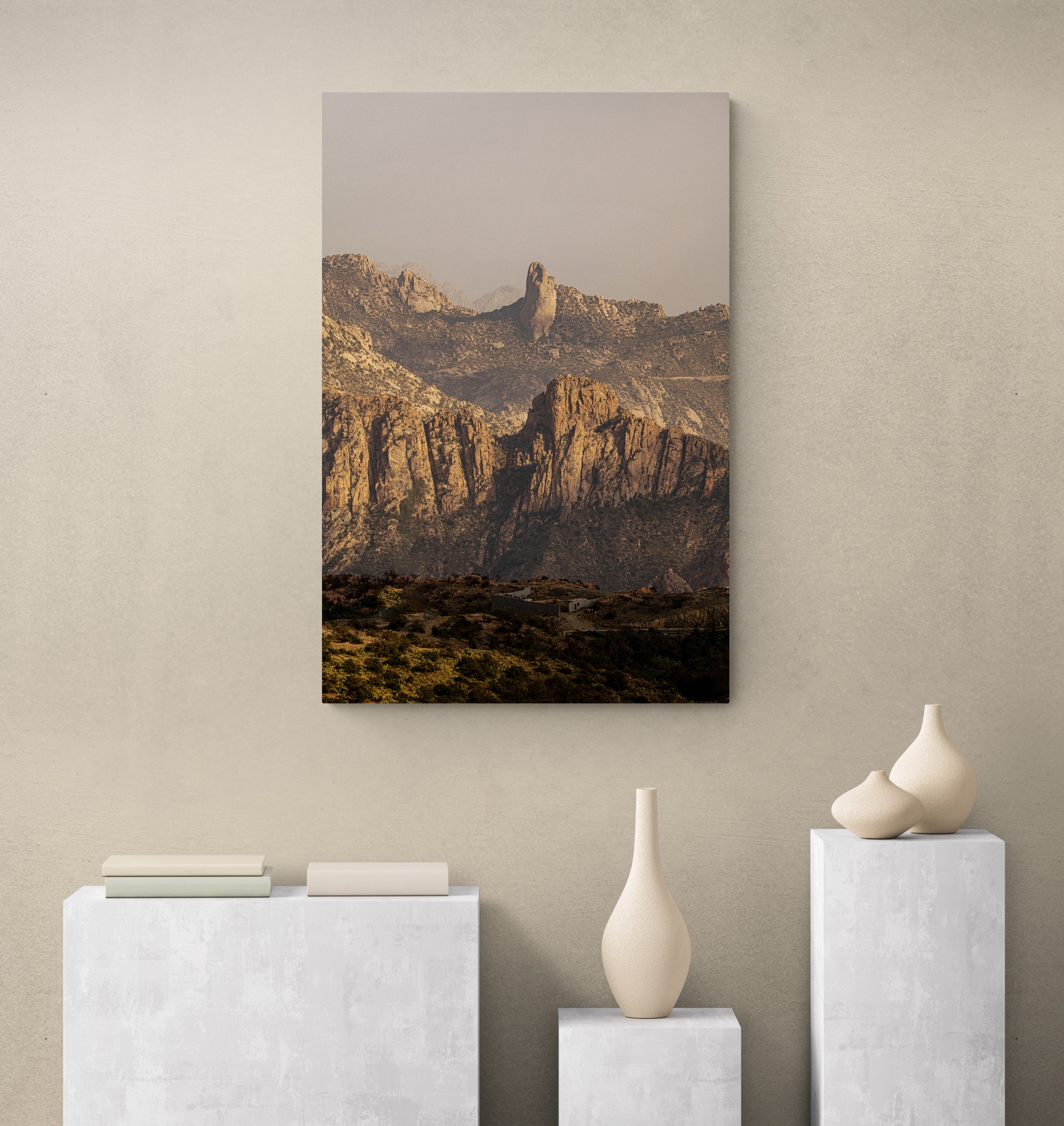 من قلب الطائف، حيث تتنفس الطبيعة عبر مرتفعات الشفا، تلتقط اللوحة لحظةً استثنائية يجتمع فيها صفاء الجو مع صلابة الجبال. الضوء الذهبي ينساب فوق النتوءات الصخرية ليكشف عن تفاصيل دقيقة في تضاريسها، فيحاكي أصالة المكان ويعيد إحياء روح الحجاز العريق. هذه اللوحة ليست مجرد منظر طبيعي، بل نافذة تبث هدوء الجبال ونقاء هوائها إلى مساحتك.