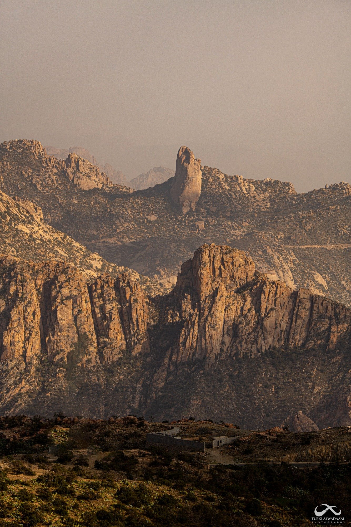 - الهوية البصرية: جبال شامخة بتكوينات صخرية مهيبة، سفوح خضراء متناثرة، وضوء ذهبي يتدرج فوق طبقات الحجاز.