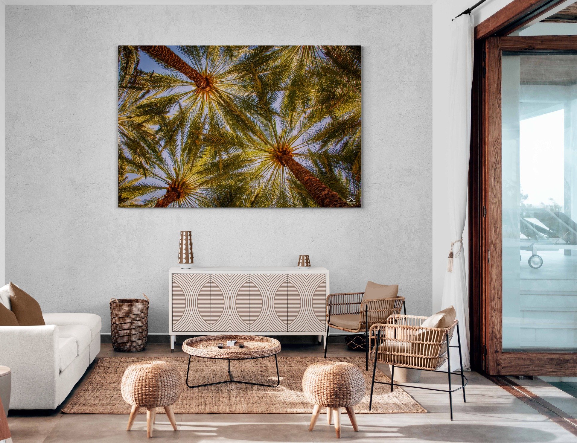 عند اقتناء هذه اللوحة، ستضيف لمكانك إحساسًا بالاتساع والسكينة. مشهد النخيل الممتد نحو السماء يمنح طاقة إيجابية ويعكس روح التجدد كل صباح، ليجعل مساحتك أكثر إشراقًا وحيوية.